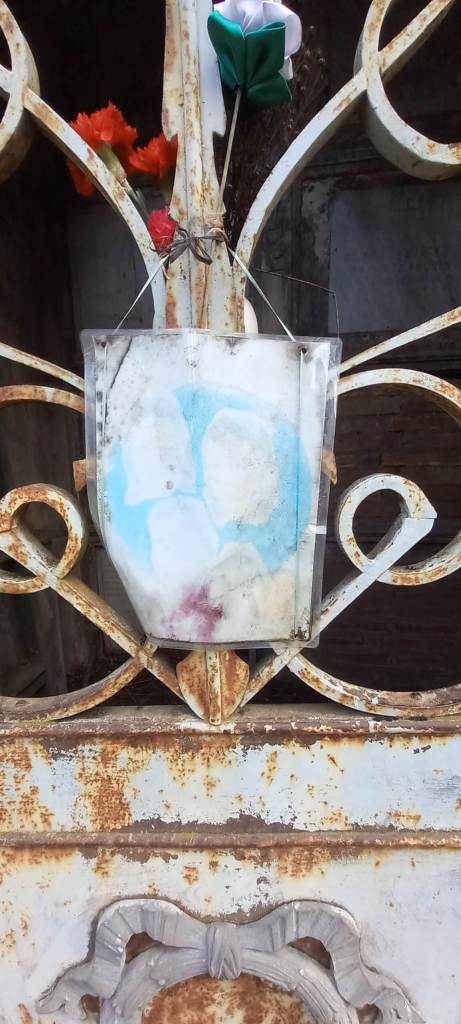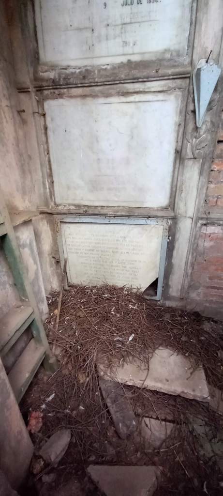 Tras una reja de fierro forjado, abriéndose espacio entre las telarañas, es posible divisar al interior seis lápidas blancas, todas con data de muerte anterior al terremoto de 1939. Llama la atención que en dos de ellas estén inscritos sendos nombres: Delfina y Margarita, en una, María y Raquel, en la otra.