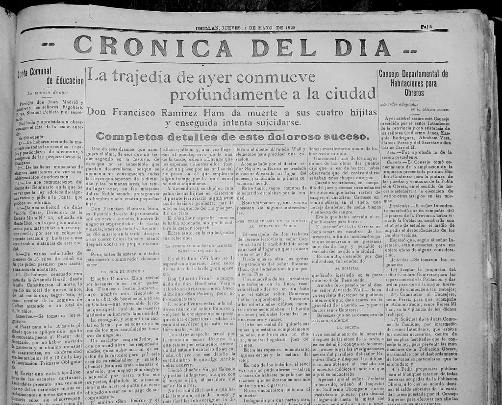 En un extenso reportaje publicado hace casi cien años, La Discusión ofrece antecedentes esclarecedores sobre el implicado, su vida y la cronología de lo sucedido aquella tarde. Cerca del mediodía, Ramírez pidió a su chofer que lo trasladara hasta el río Ñuble, junto a sus hijas Margarita y Delfina, gemelas de 10 años, María, de 7 y Raquel, de 5. Las niñas estaban a su cuidado, ya que cinco años antes había fallecido la madre, Margarita Prunes (1885-1917), según se logra leer en una lápida del mausoleo.