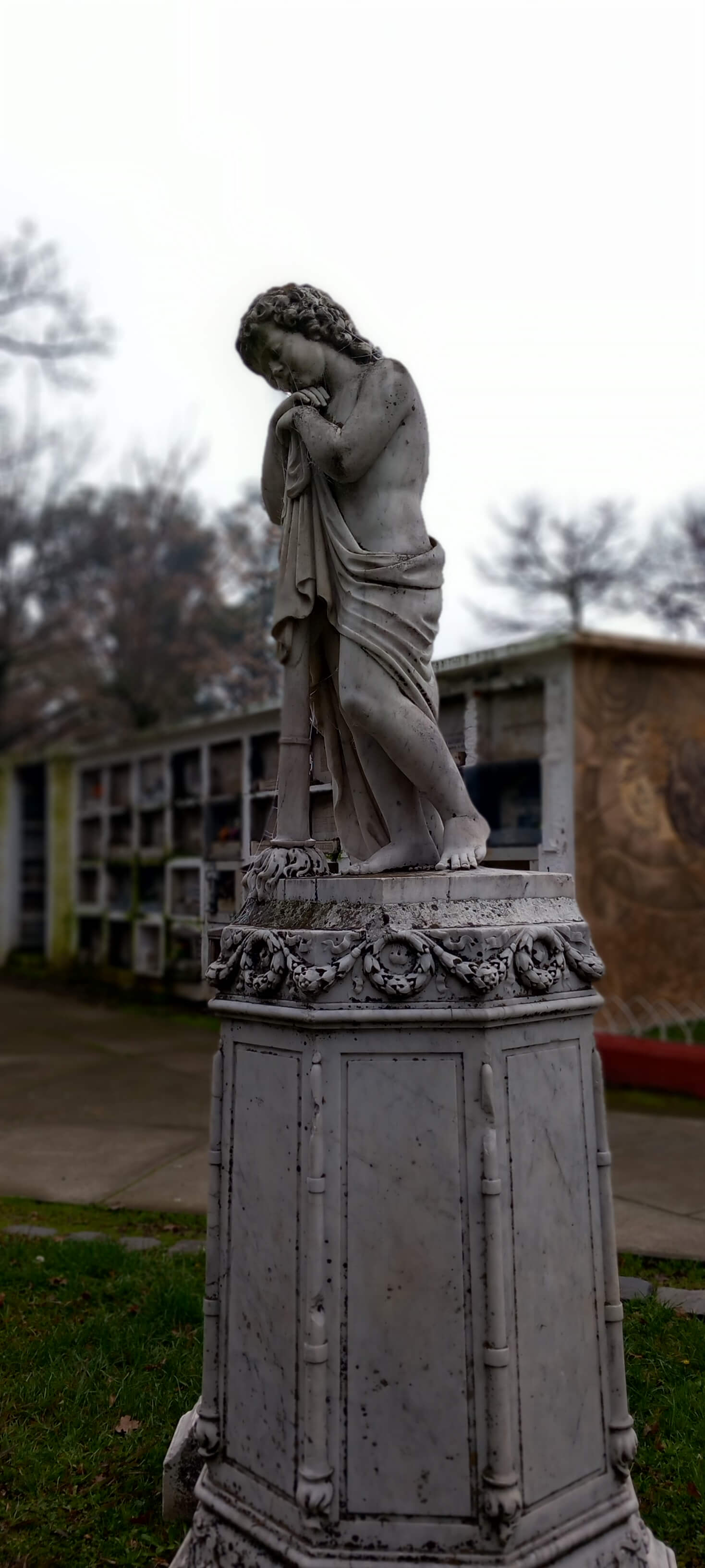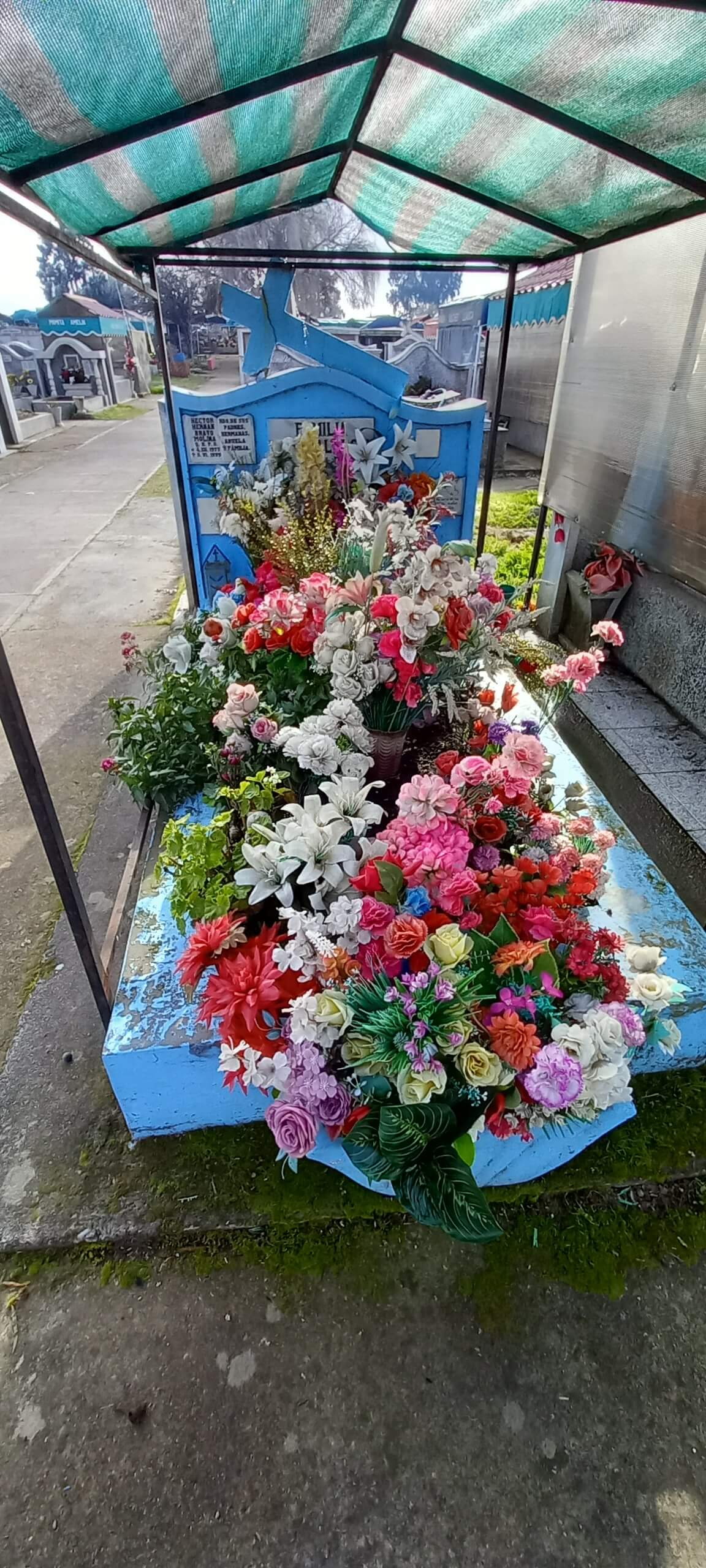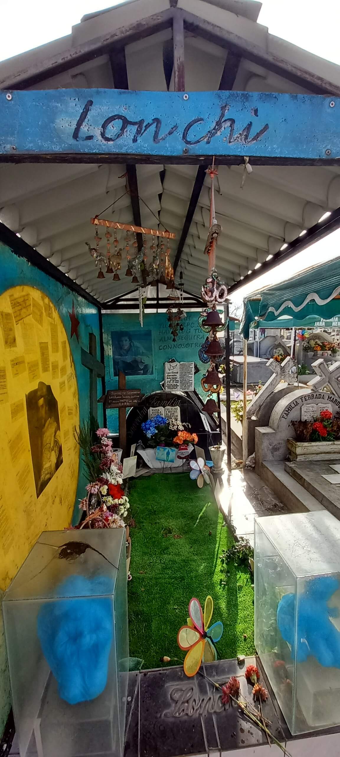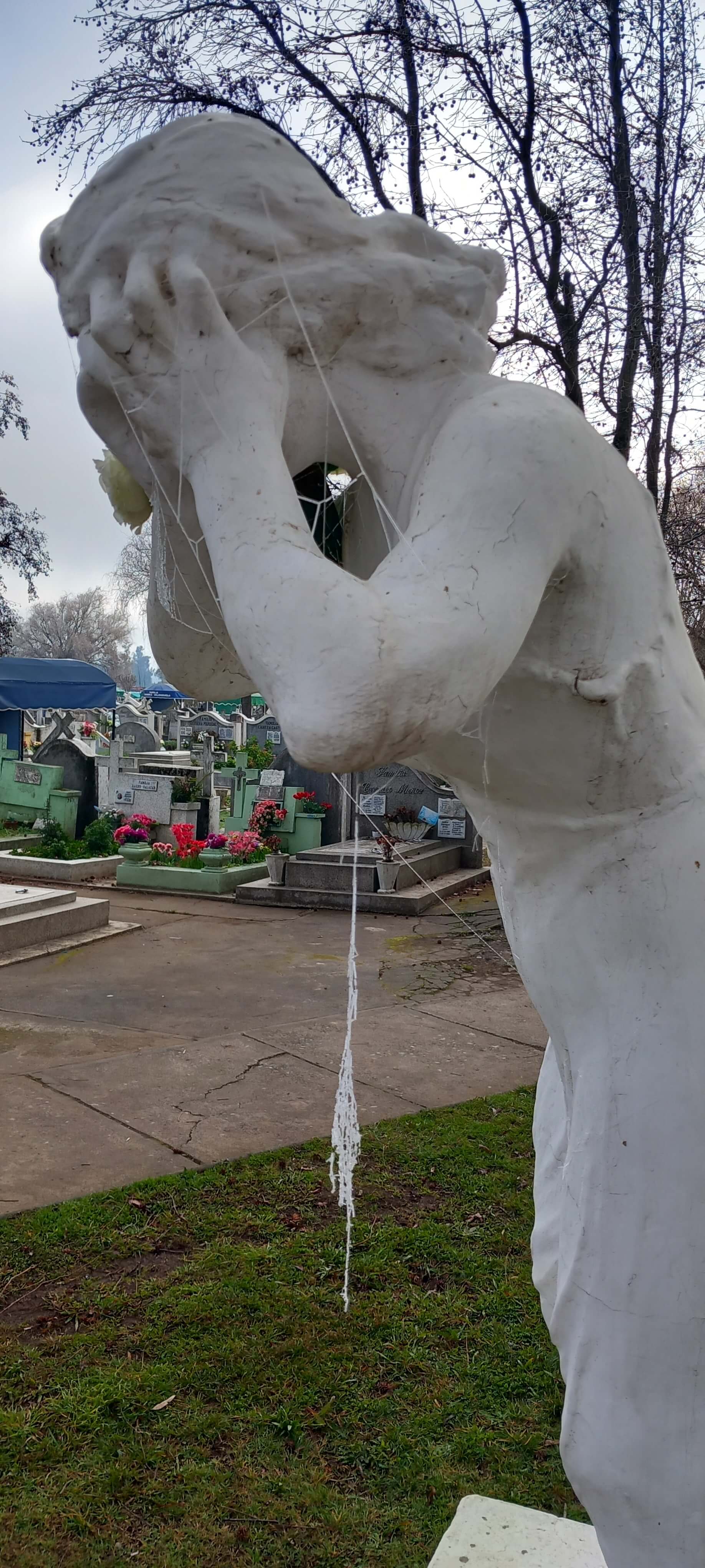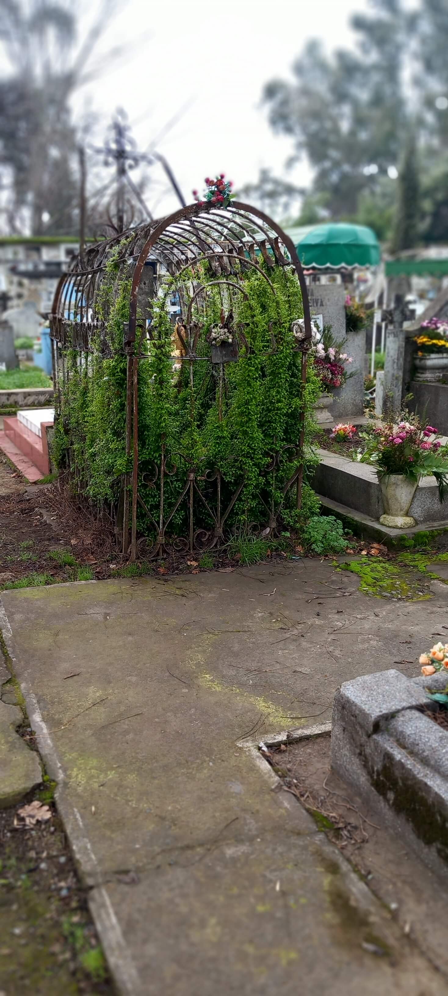 Incluso en la muerte la segmentación por barrios está presente: los árboles peinados, las amplias avenidas y el pasto recién cortado rodean lujosos mausoleos decorados con mármoles, vitrales y esculturas del Cementerio Municipal de Chillán. Quebrando el espacio aparecen los bloques de nichos separados por pasillos estrechos, igual que casas pareadas y edificios urbanos en bloque. Más allá, la heterogeneidad. Tumbas sobrias junto a otras maximalistas, en coexistencia con otras muy precarias a las cuales se accede por senderos lodosos. De estas hay por doquier: lechos de tierra cercados por rejas oxidadas o deslindes imaginarios que se pierden entre la voraz maleza. Imposible no conmoverse con el desolador colorido del patio de los angelitos, el de los niños, ahí la ternura y el dolor cohabitan en cunas de tierra delimitadas por rejas de madera, donde abundan los juguetes, los remolinos y las flores artificiales. Como en la vida de carne y hueso, en el cementerio también confluyen todas las contradicciones sociales.