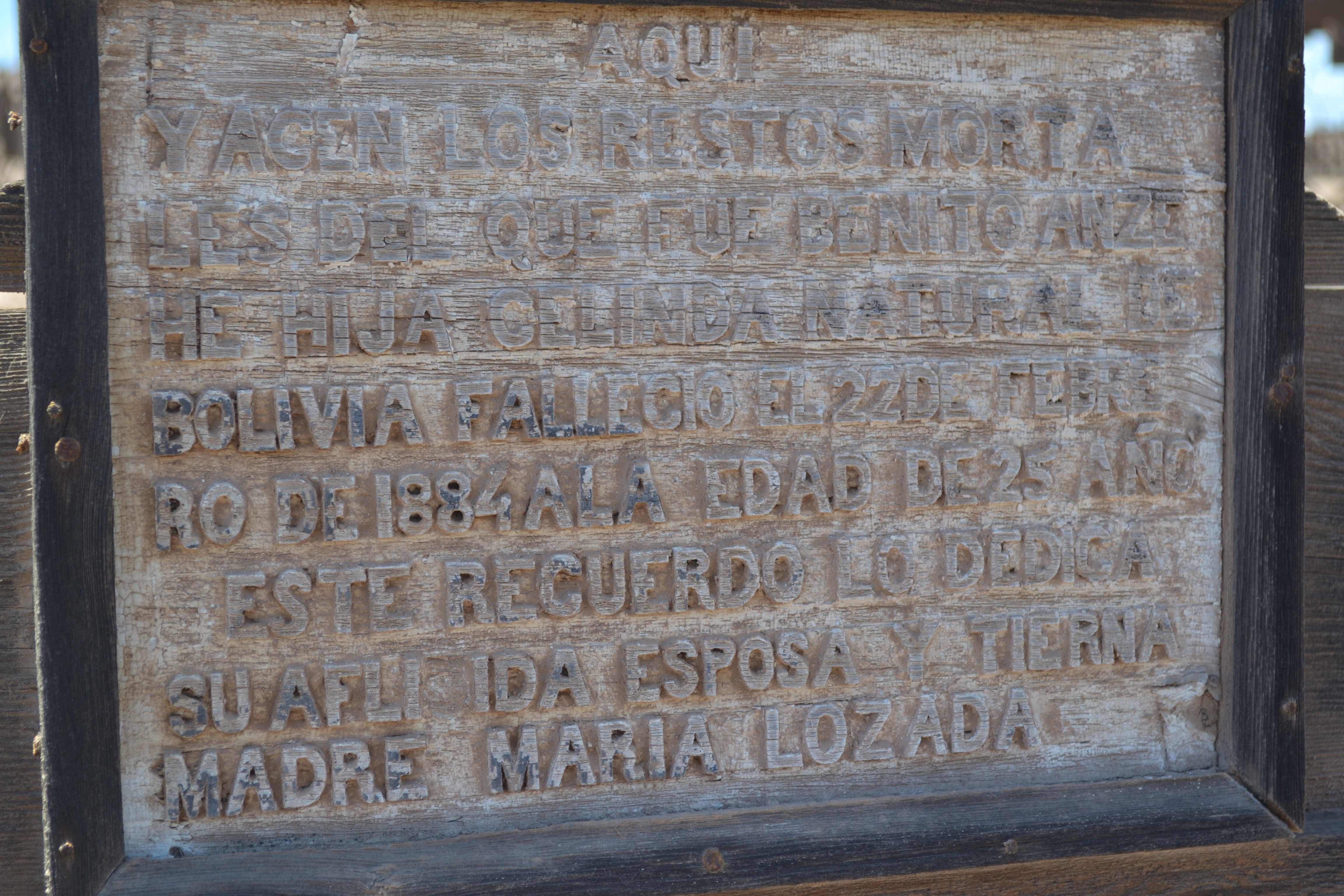 “Aquí yacen los restos mortales del que fue Benito Anze e hija, natural de Bolivia. Falleció el 22 de febrero de 1884 a la edad de 25 años. Este recuerdo lo dedica su afligida esposa y tierna madre María Lozada”.